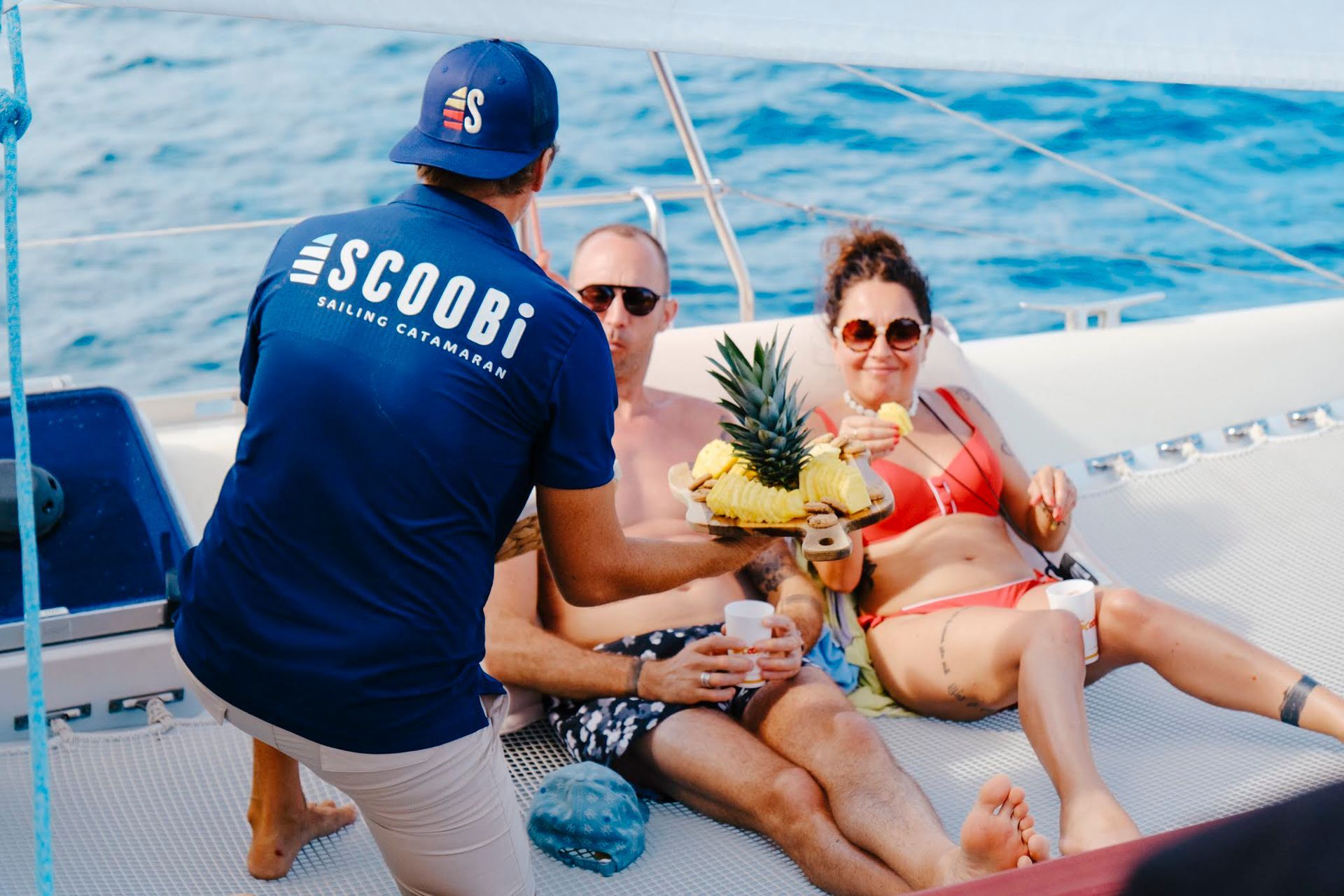 Scoobi, our elegant 53-foot catamaran, and set sail for a full day of